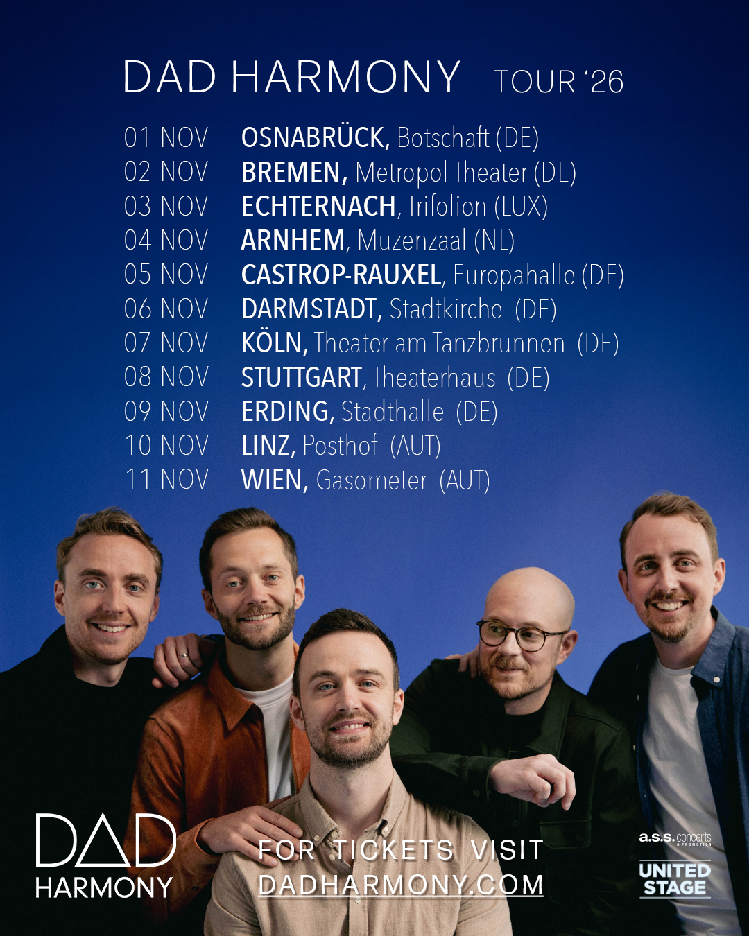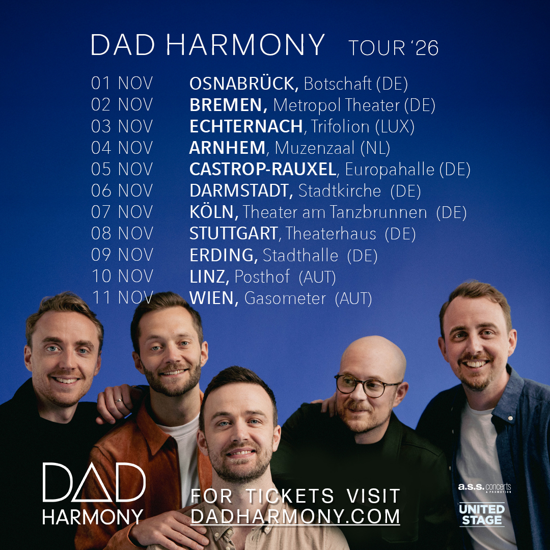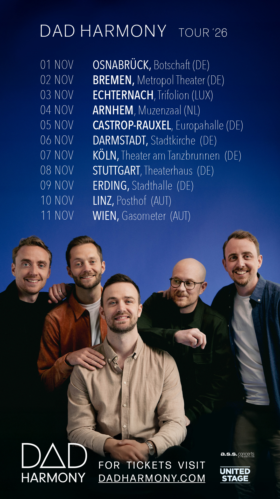 Peter Vidmark, Tomas Vidmark, Sebastian Åkesson, Adam Stenlund und Michael Åberg bilden zusammen DAD HARMONY und sind begeistert von der Resonanz ihrer Fans in Europa. Deshalb kehren DAD HARMONY im November 2026 zurück. Insgesamt spielen sie 11 Konzerte in Deutschland, Österreich, Luxemburg und den Niederlanden. Die Väter laden ihre Fans zu einem erfüllenden Abend voller harmonischer Klänge und Mitsingsongs ein. Glücklich und beschwingt gehen die Fans danach nach Hause.