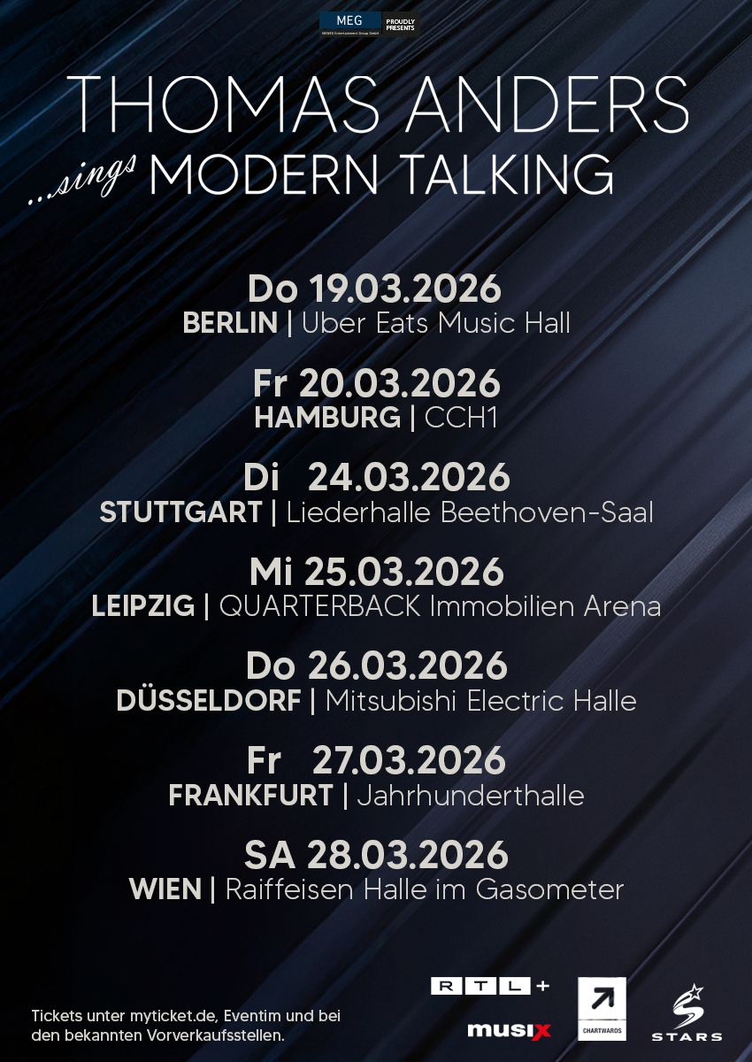 Zum 40-jährigen Jubiläum von Modern Talking überrascht Thomas Anders seine Fans im März 2026 mit einer spektakulären Deutschland-Tournee, die die unvergesslichen Hits des legendären Pop-Duos sowie weitere Klassiker der 80er Jahre feiert. Die „THOMAS ANDERS sings MODERN TALKING-Tour“ ist nicht nur (s)eine liebevolle Hommage an die Musik eines der beliebtesten und prägendsten Musikjahrzehnte, sondern auch eine Premiere für die sensationellen Neuaufnahmen der ersten sechs Modern-Talking-Alben. Damit ist der Künstler der erste seiner Art, der sein komplettes Frühwerk neu interpretiert und damit auf Tour geht!